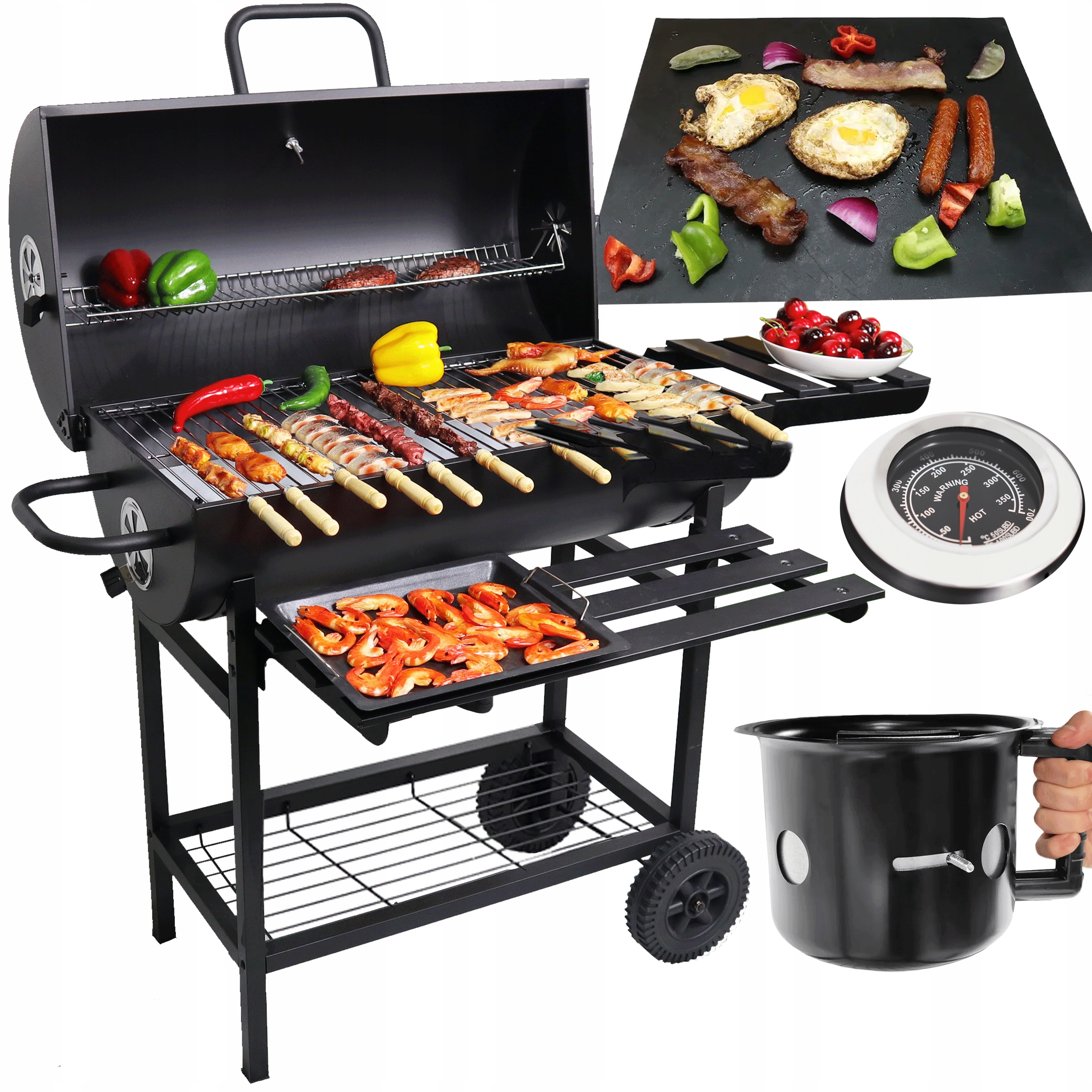 Grill Węglowy Ogrodowy z POKRYWĄ Duża Beczka Popielnik Termometr Półki Waga 16.6 kg