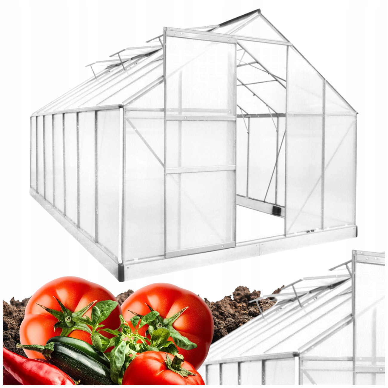 • Zainwestuj w jakość i komfort uprawy! Ta duża szklarnia z poliwęglanu i aluminium zapewni Twoim roślinom idealne warunki rozwoju przez cały sezon – niezależnie od pogody!